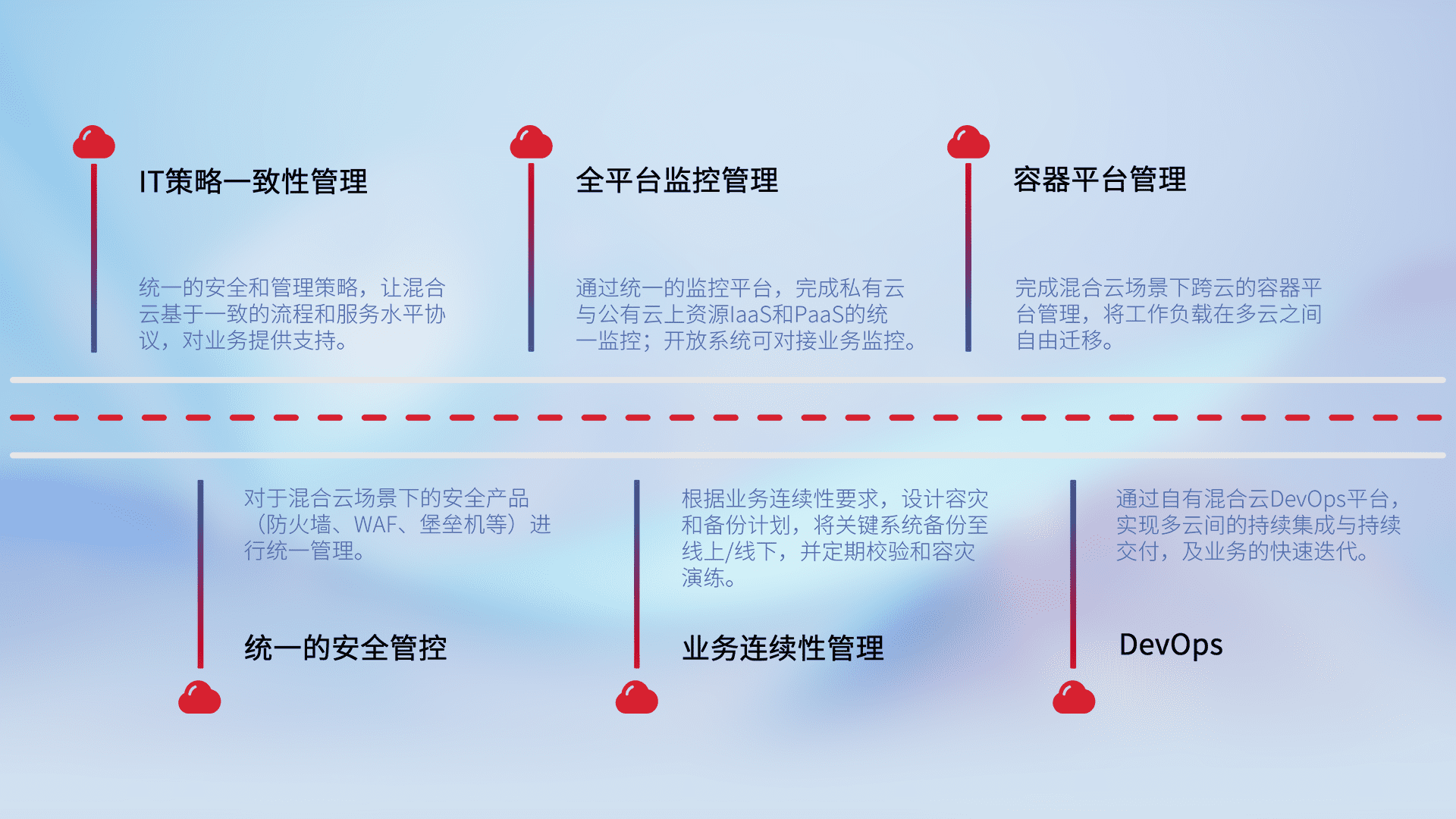 通过多云纳管,,,,以统一的资源数据模型把客户的云资源进行抽象和封装,,进而实现对多云资源的统一操作,,保障云资源管理的可靠性、、、、稳定性与可用性。。。。量身定制化运维内容,,,,配置、、、开发运维、、、、补丁管理、、、备份、、监控、、、认证和访问管理、、审计和日常巡检等,,,,保障在用云过程中的可靠度,,,稳定度以及高可用率。。。